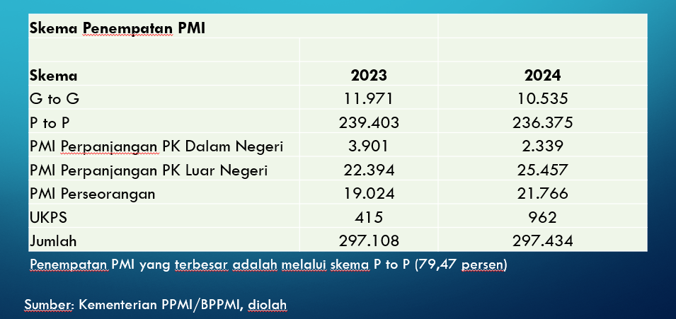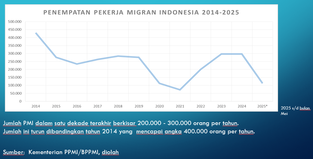 Saat ini, Indonesia mengerahkan 200.000-300.000 PMI setiap tahunnya, namun angka ini sekitar 30% lebih rendah dari angka tahun 2014-2015. Penempatan Pekerja migran ini kembali menanjak lebih dari 176% pada tahun 2022 dan bertambah 37% pada tahun 2023.