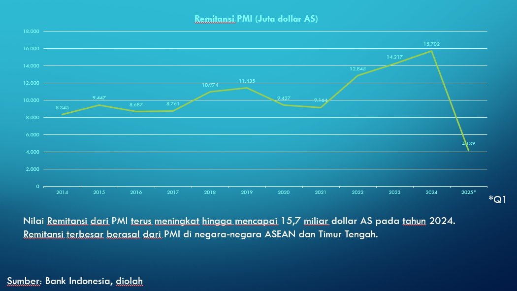 Pada tahun 2024, remitansi PMI mencapai Rp253,3 triliun. Sedangkan tahun ini, Kementerian Perlindungan Pekerja Migran Indonesia/Badan Perlindungan Pekerja Migran Indonesia (BP2MI) menargetkan sumbangan devisa dari PMI sebesar Rp436 triliun.
