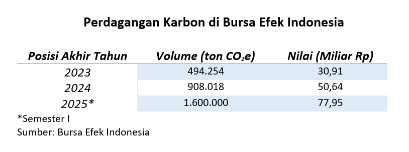 Di tahun 2024 perdagangan karbon 413.764 ton CO2e dengan nilai Rp 19,73 miliar. Namun, di semester pertama 2025 volume perdagangan melesat 691.304 ton CO2e dengan nilai Rp 27,31 miliar. Jauh melampaui kondisi tahun 2024.